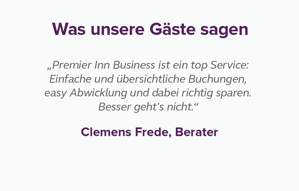 Business Booker heißt jetzt Premier Inn Business. Für Sie ändert sich dadurch nichts: Alle bekannten Vorteile bleiben unverändert bestehen und Sie profitieren von einer verbesserten Nutzeroberfläche für eine intuitivere Bedienung.