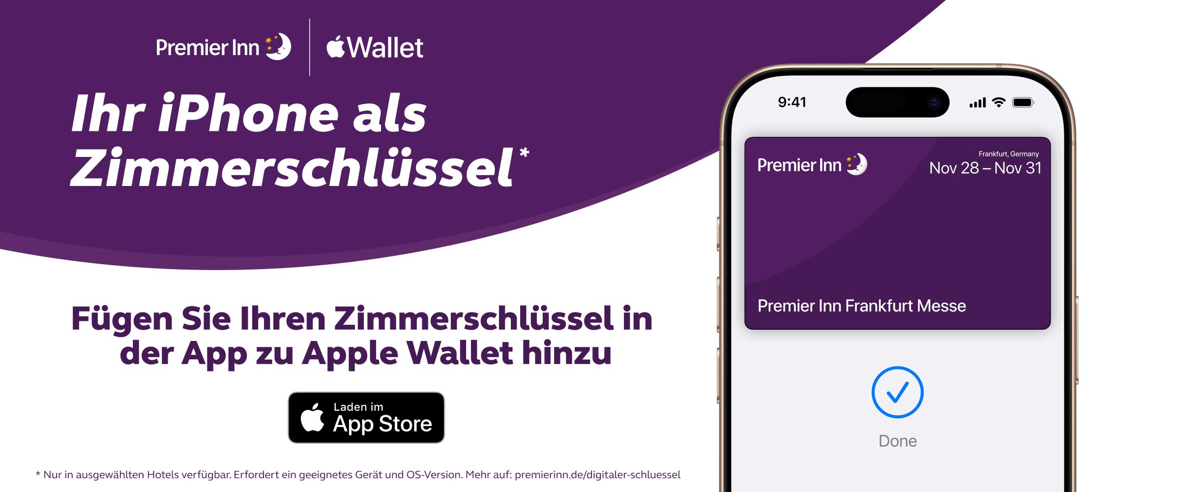 Öffnen Sie vor Ihrer Ankunft die Premier Inn App. Sobald Sie online eingecheckt haben und Ihnen ein Zimmer zugewiesen wurde, können Sie den Zimmerschlüssel zu Apple Wallet hinzufügen. Er wird aktiviert und ist sofort einsatzbereit – dann brauchen Sie nur Ihr iPhone oder Ihre Apple Watch, um Ihr Zimmer zu öffnen.